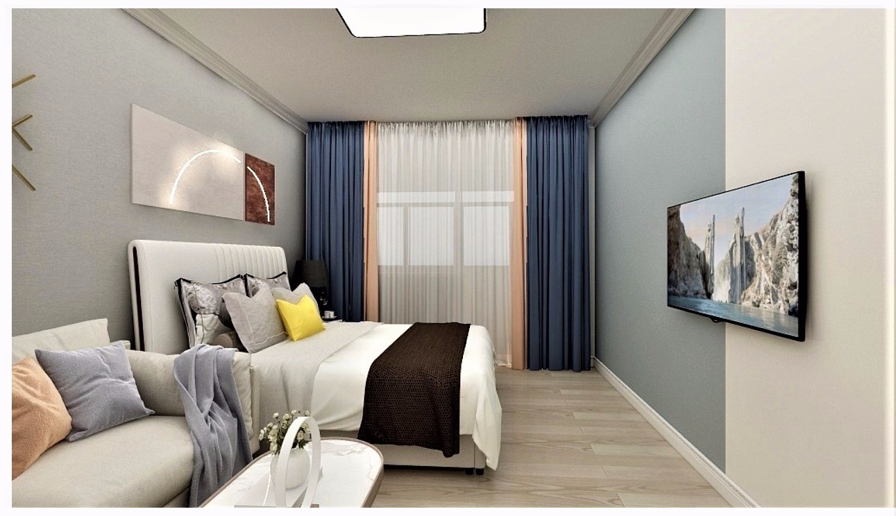 多角度展示,床尾墙面为拼色,这样墙面会避免单一,增加一些跳跃感。