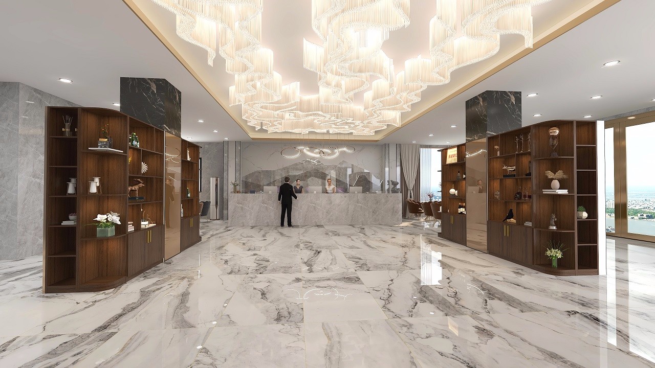 大厅采用大理石背景墙,层层叠叠的大理石装饰墙面,大气恢弘