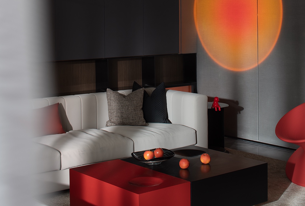 红与黑是所有色彩搭配中最经典的组合。红的热烈、黑的沉浸冷酷,在碰撞阐述空间情节,与周围的白灰搭配,也有了个性与风格。