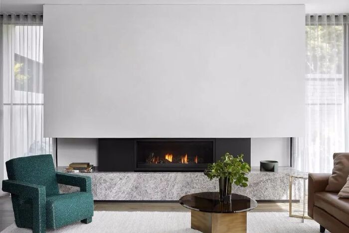客厅的氛围轻松明快,两侧通高的玻璃窗,为室内带来充足采光与良好的自然通风。客厅的核心区域,黑色的壁炉镶嵌在两个由天然石材与抛光石膏制作的水平体块之间。同时,自然的木质色调与明亮的空间形成和谐的色彩平衡。