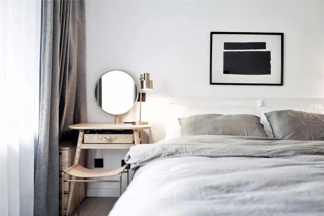 主卧室的选择了白墙搭配灰色调软装的设计,营造出轻松感。 用一个梳妆台来代替床头柜,让日常使用变得更为方便。