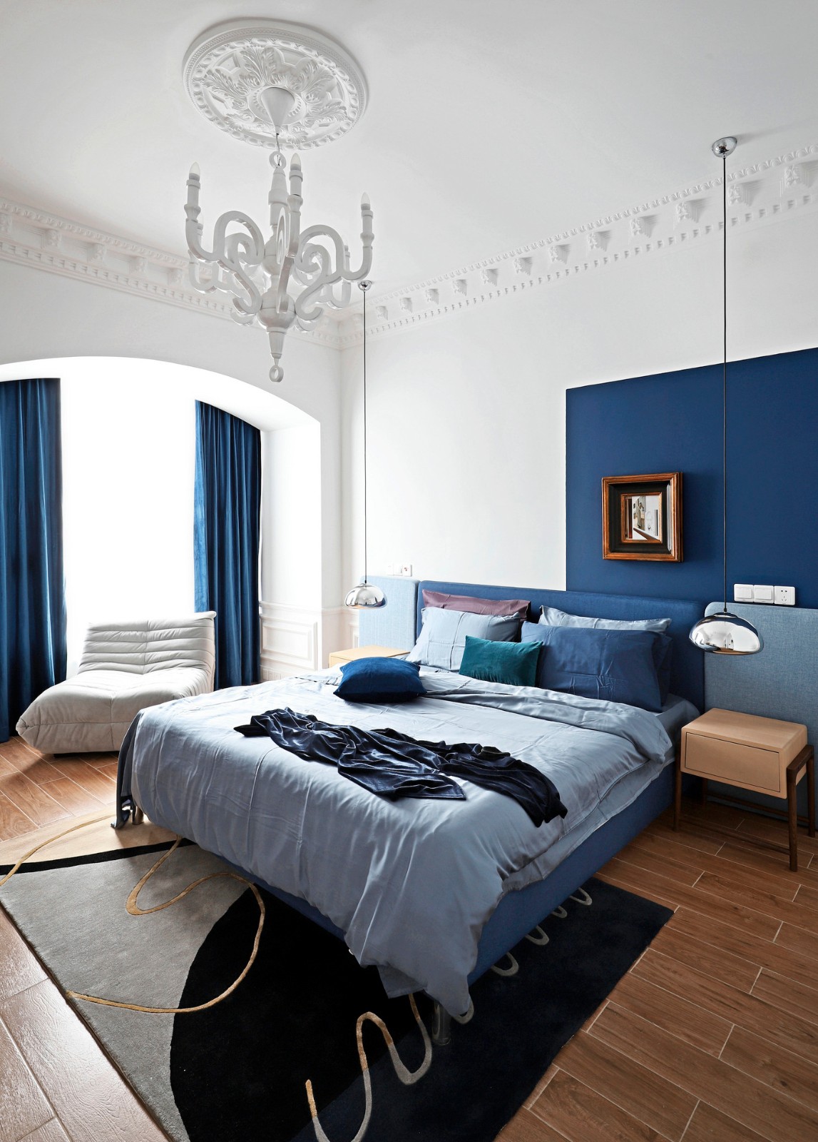 空间中最重要的采光和通风的窗户,设计师也做了柔性的处理,将其设计成半弧形的视觉感,加上功能强大的贵妃沙发,给空间增加了功能和舒适度,(在空间的灯光上设计师基本还原了法式住宅的感觉)。