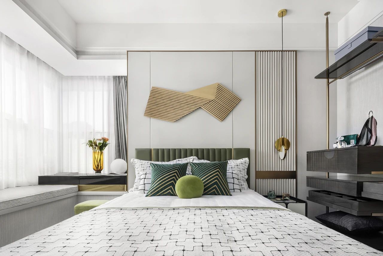 主卧的绿色一扫以往的清新,以不同软装的线条、材质、展现自我时尚却又不显浮夸,温柔流畅的线条似半梦半醒之间惊艳了时光,在温暖的灯光渲染下呈现复古华丽的生机又极富淡雅的气质,成熟厚重而饱满。