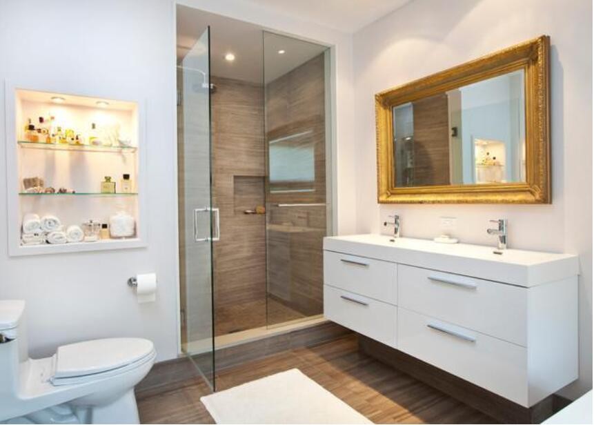 柔灰的墙面、棕灰渐变地毯和灰白花纹大理石地砖交相辉映,