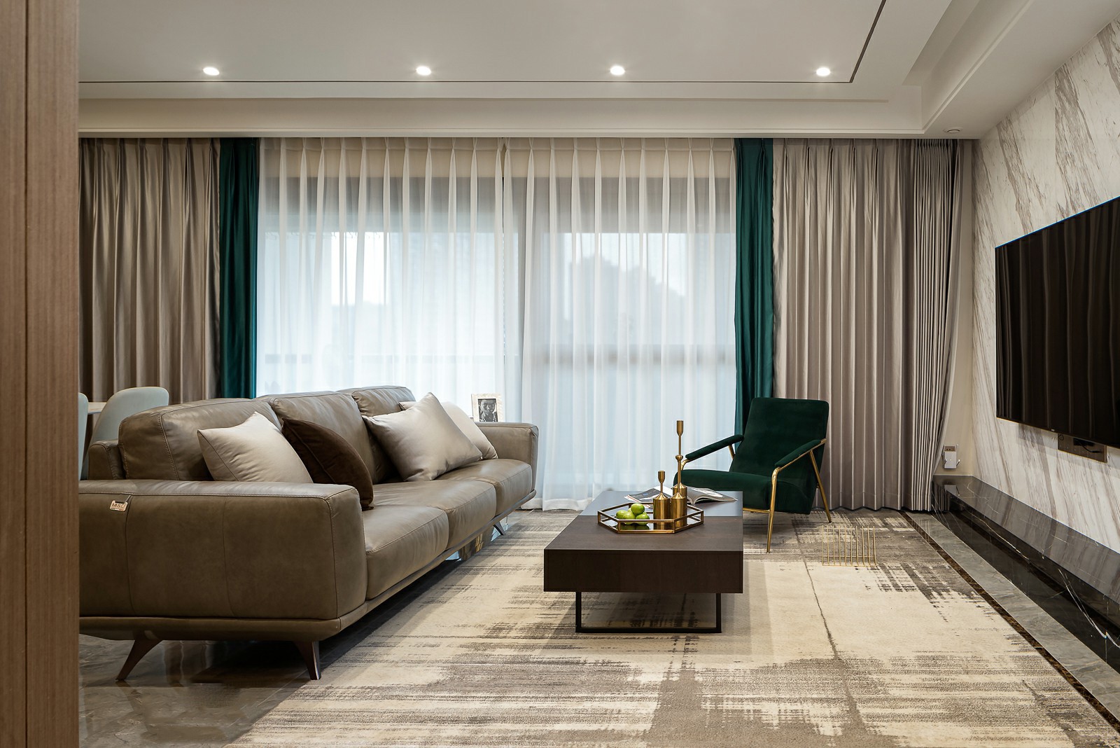 皮质沙发和黑色单椅,加上茶几的理性色彩,使得整体空间显得优雅而低调。