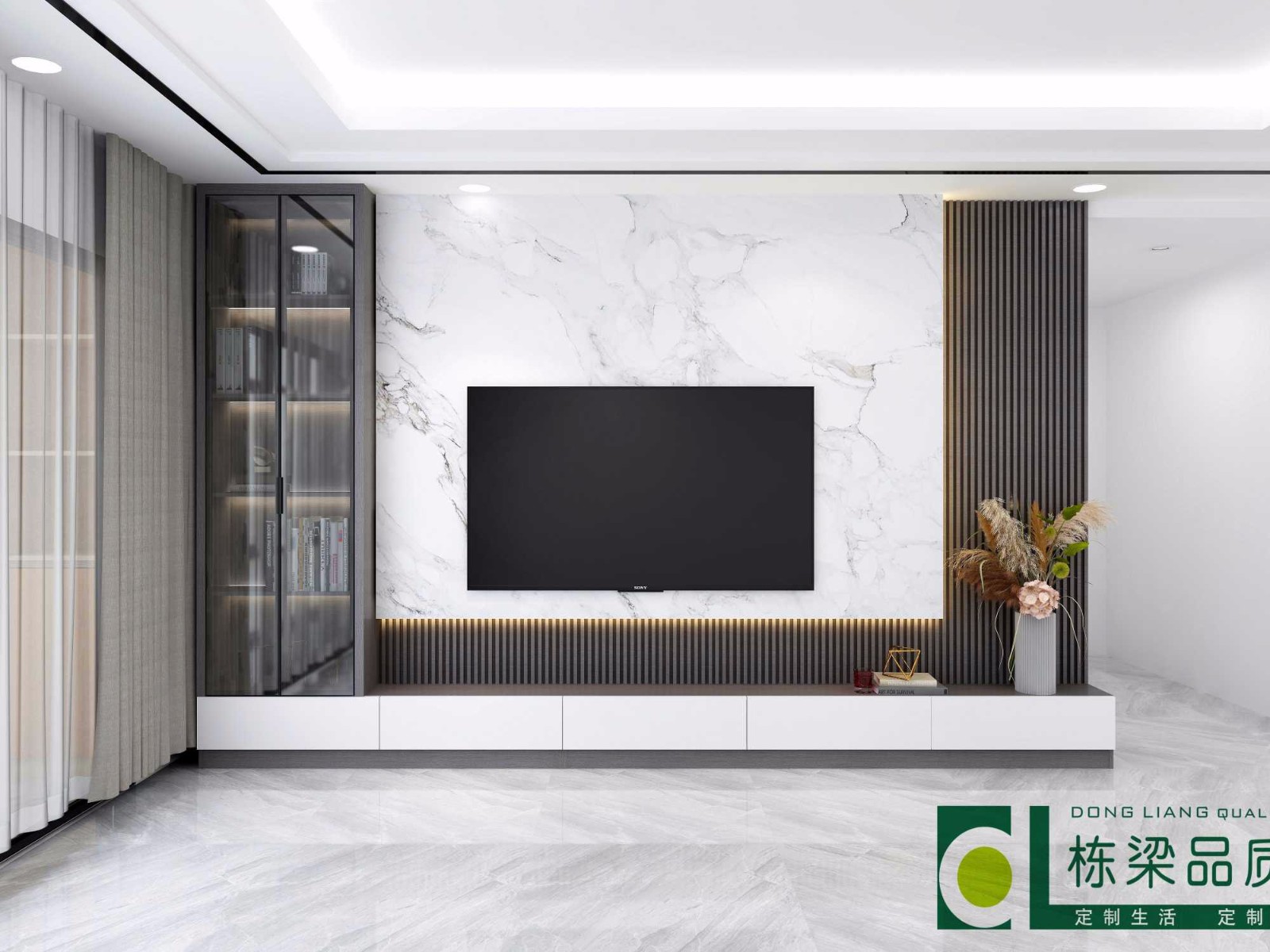 入户靠窗设计鞋柜,无拉手设计。 电视柜格栅+黑色铝框玻璃门+大理石背景墙!