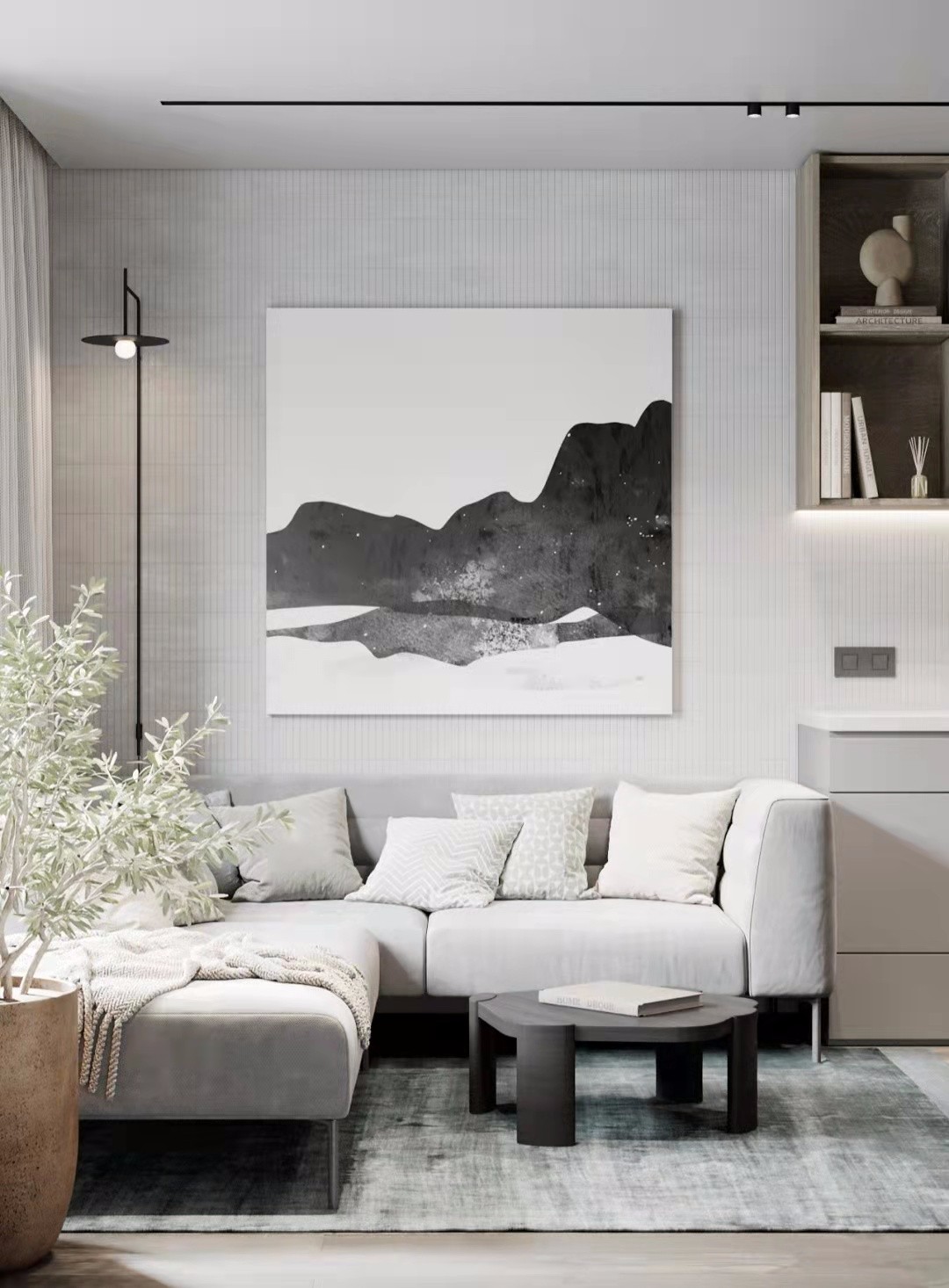 卧室的整体空间简洁明了。床头背景墙由 白色墙壁和温暖的灰色壁裙组成,两者以 交错的方式排列,使视觉层次更加鲜明。
