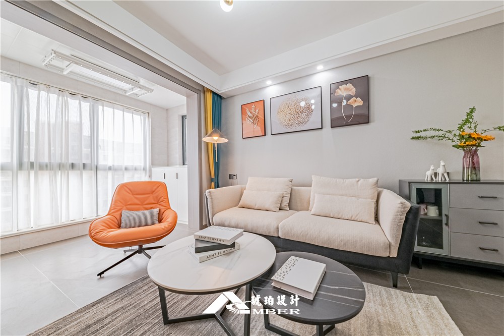 灰白格调,窗帘采用橙色系,使整体空间看似静谧又显得有活力。