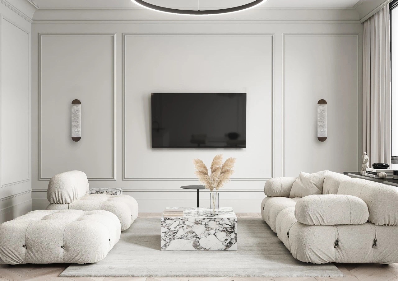 空间以白色为主,搭配原木鱼骨拼地板,大理石材质点缀,内敛不失优雅。