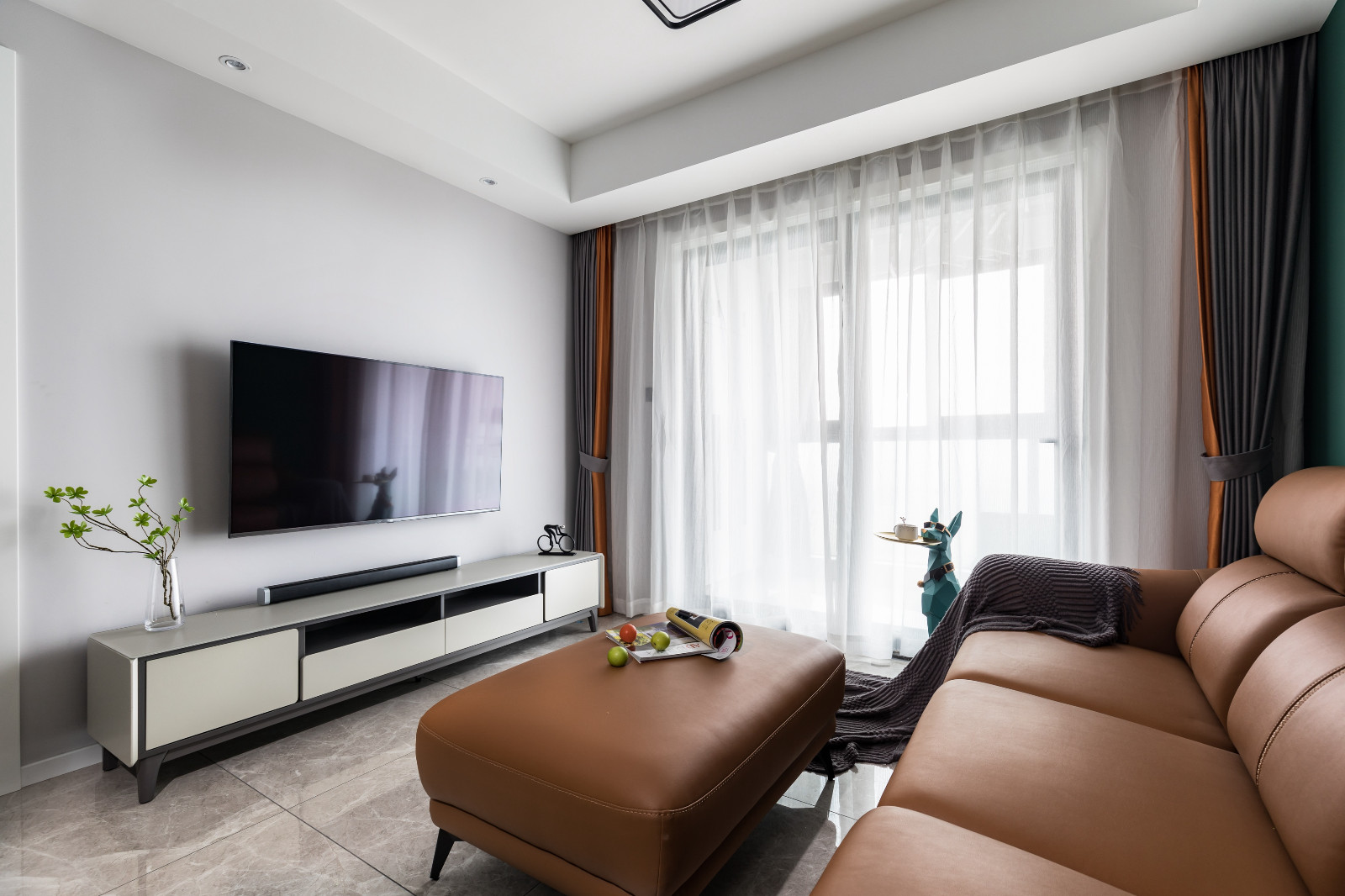 客厅整体简单大方,整面高纯度孔雀绿色乳胶漆做背景墙,搭配对比鲜明的土橙色皮质沙发,跳色搭配相当吸睛。