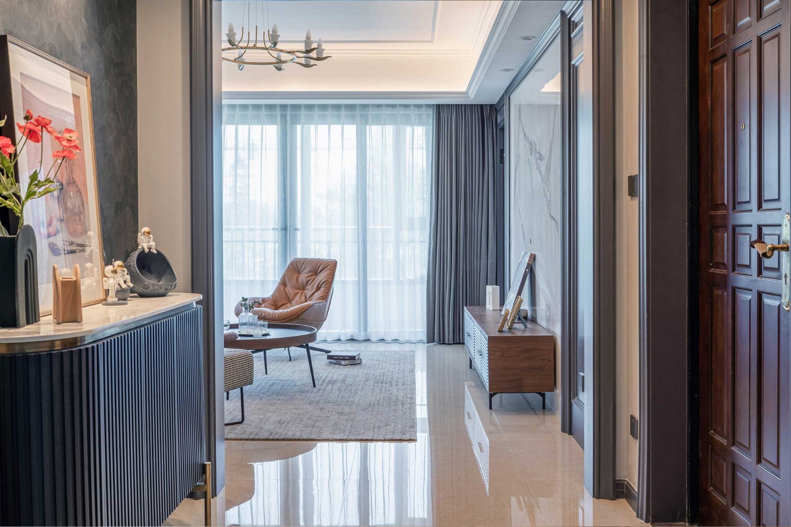 既巧妙地对客餐厅做了一个衔接式隔断,也让单薄的空间显得更为饱满,当然也局部提高了家居储物空间。