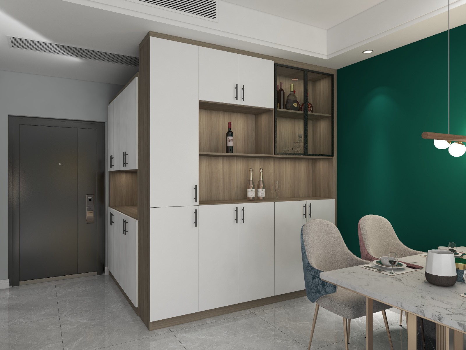 进门入户鞋柜,侧边做酒柜,增加餐厅的实用率,外加玻璃门做镂空增加美观性