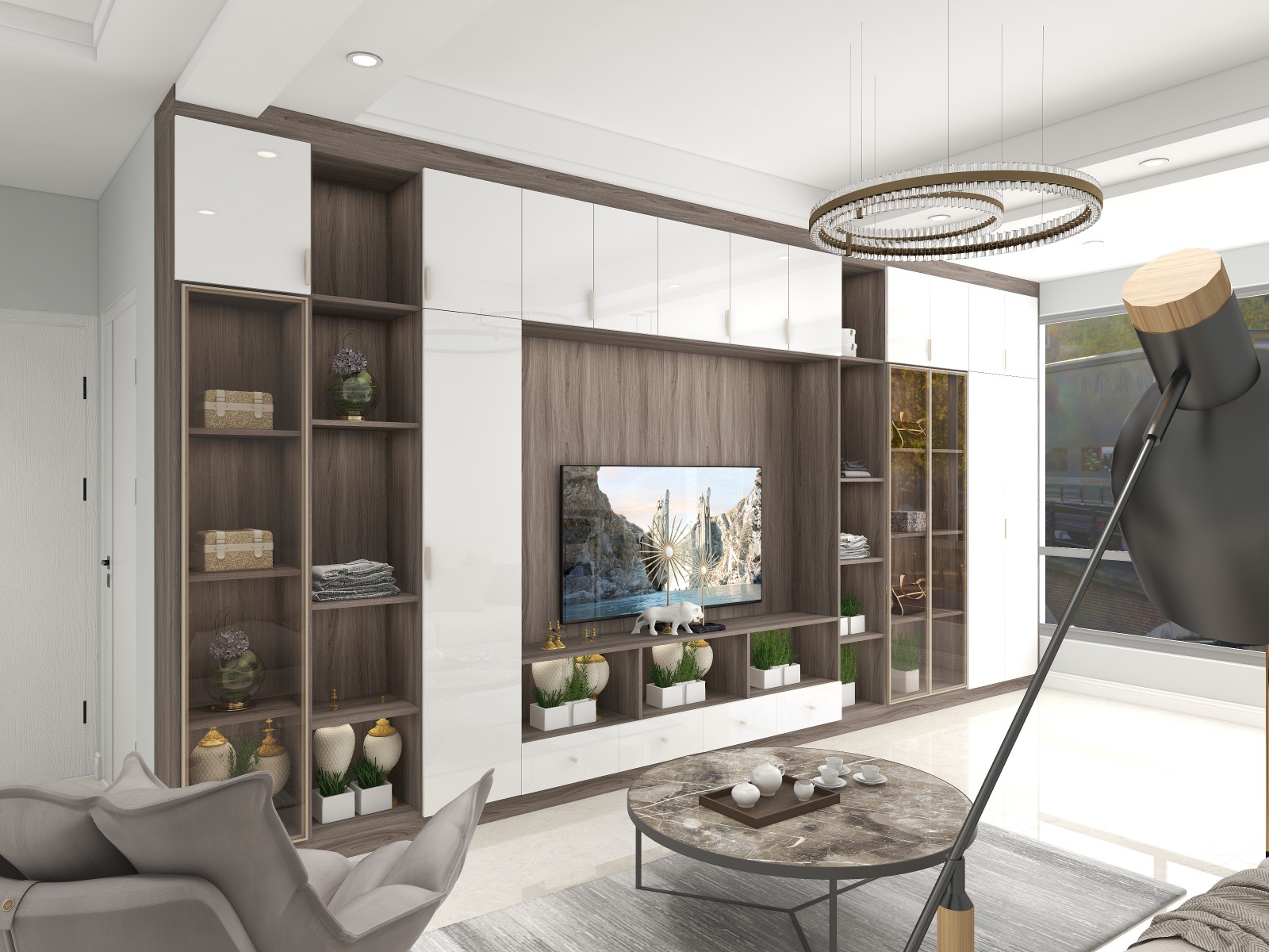 电视墙做整墙电视柜,储存空间足够,做玻璃门清爽简约美观