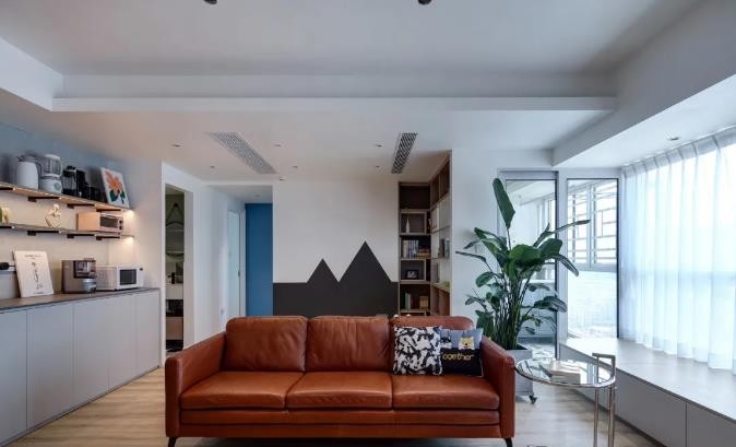 北欧风的暖棕色主沙发搭配钢玻元素的通透边几,阳台大部分纳入客厅,还有一部分规划为生活阳台