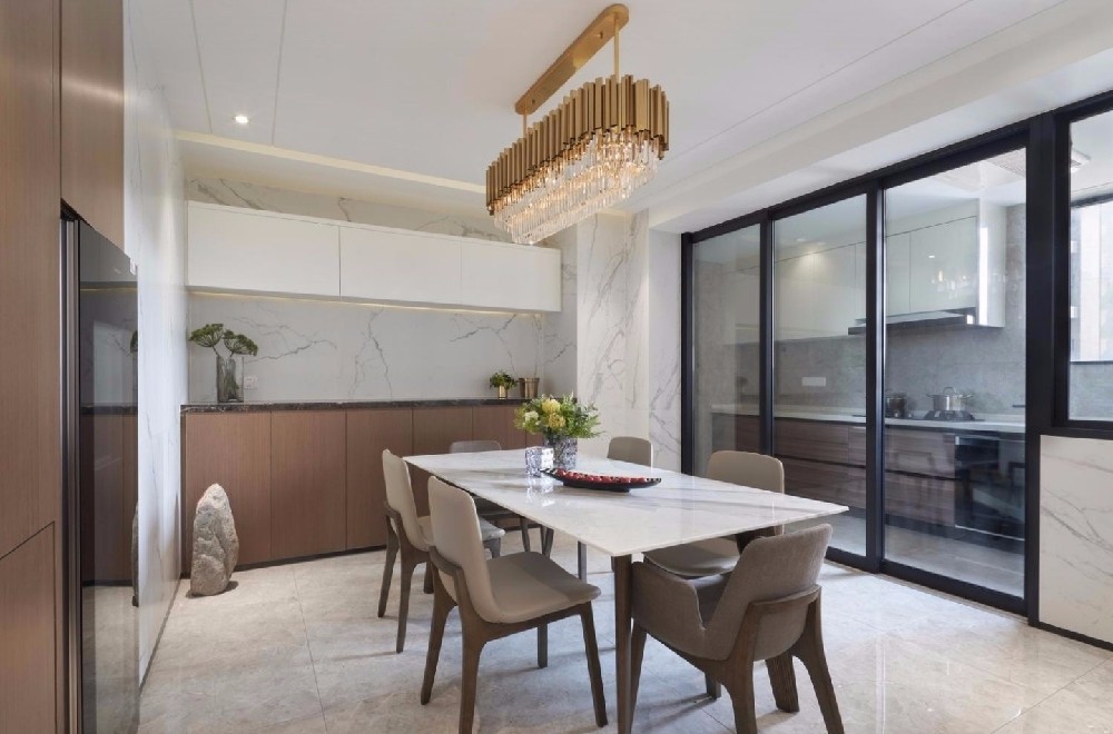 将与阳台接壤的墙面重新开拓出新窗。才得到现在的明亮感,木色的横纹与黑色元素带出硬朗的极简氛围。右侧冰箱还未入场。