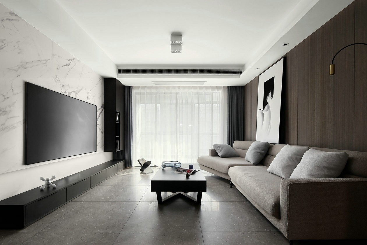 客厅电视背景墙采用白色纹理大理石,沙发背景采用深咖色饰面板,空间感,***质感来自于颜色和材质的结合运用