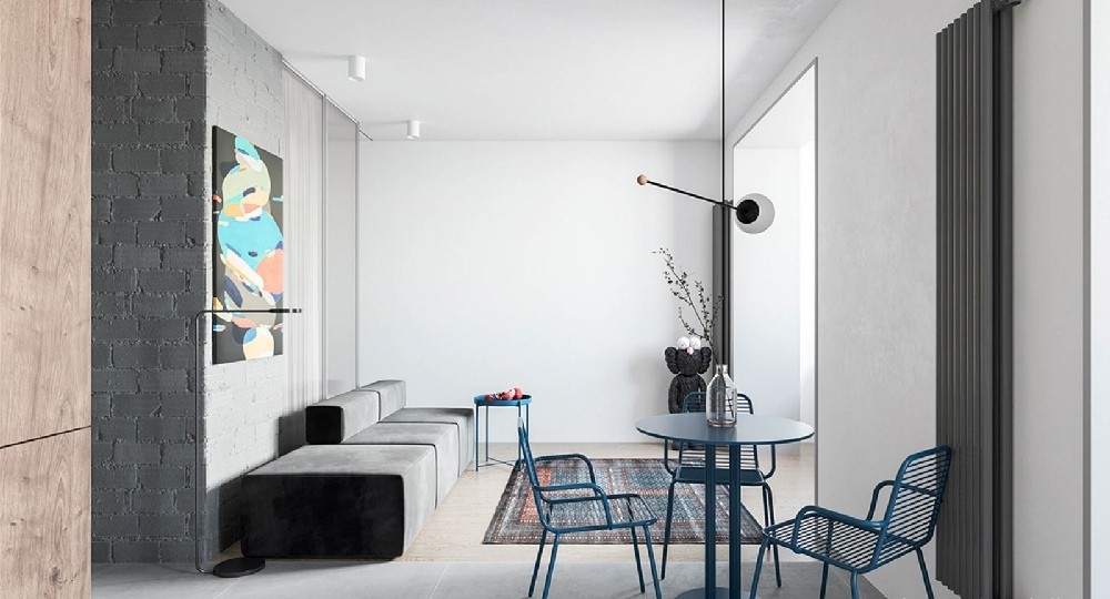 这是一套单人居住的现代简约风的50㎡公寓,这间公寓采用中性色彩作为基础,并使用抛光且色彩鲜艳的家具,还结合了一些明亮的元素。例如亮色的餐桌椅、墙面上的画等,使公寓看起来既温馨又愉悦。
