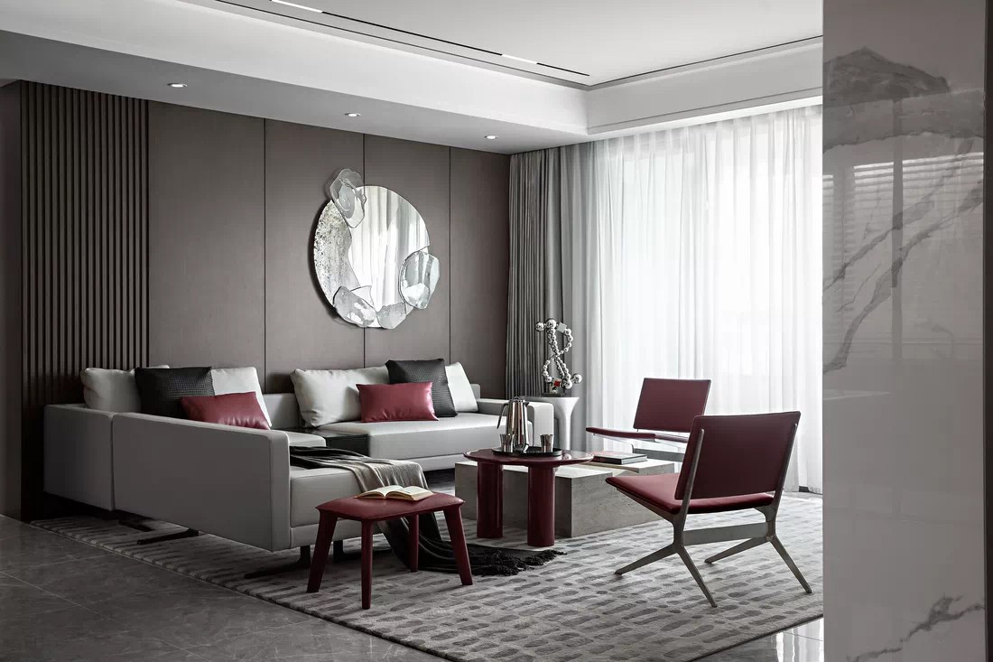 棕褐色的木质墙饰、酒红色的皮具座椅、卡其灰的石灰岩茶几、灰白相间的柔软地毯,在一片灰调中各放异彩,带来愉悦的视觉享受和令人欣喜的触感。 设计师利用简约大气的浅灰白沙发,将所有精彩完美融合,如同节奏明朗的奏鸣曲。