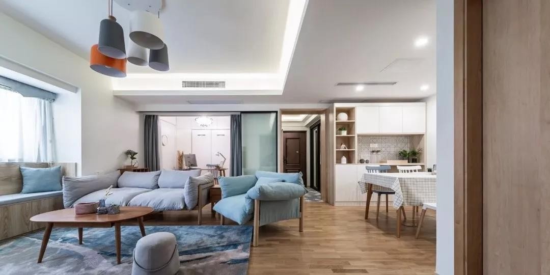 经过玄关,客餐厅相连,南北通透、采光充足,以过道做自然分割