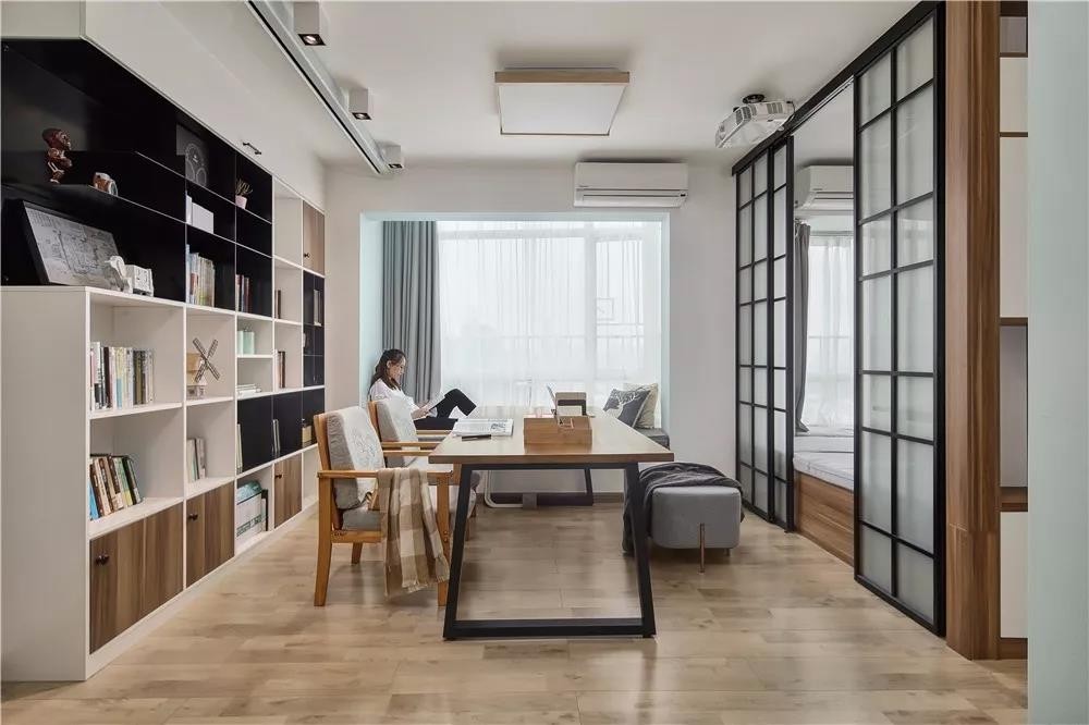 两个人的工作性质都是需要经常加班 两个人的相处时间就会变少 所以设计师在客厅装了一张足够两人办公的桌子 这样可以在家加班 一边搬砖,一边相互陪伴