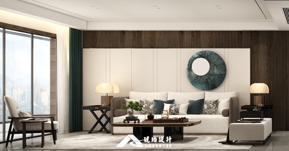 本案以茶具、摆件、挂饰、深色木饰面为基调来展现人文气息,东方韵味。整个空间色彩明亮,简单雅致,绿植与摆件相呼应,禅意宁静,空间的一静与一动相互呼应,与大自然相接触,回归自然,感受自然的清凉与花香。