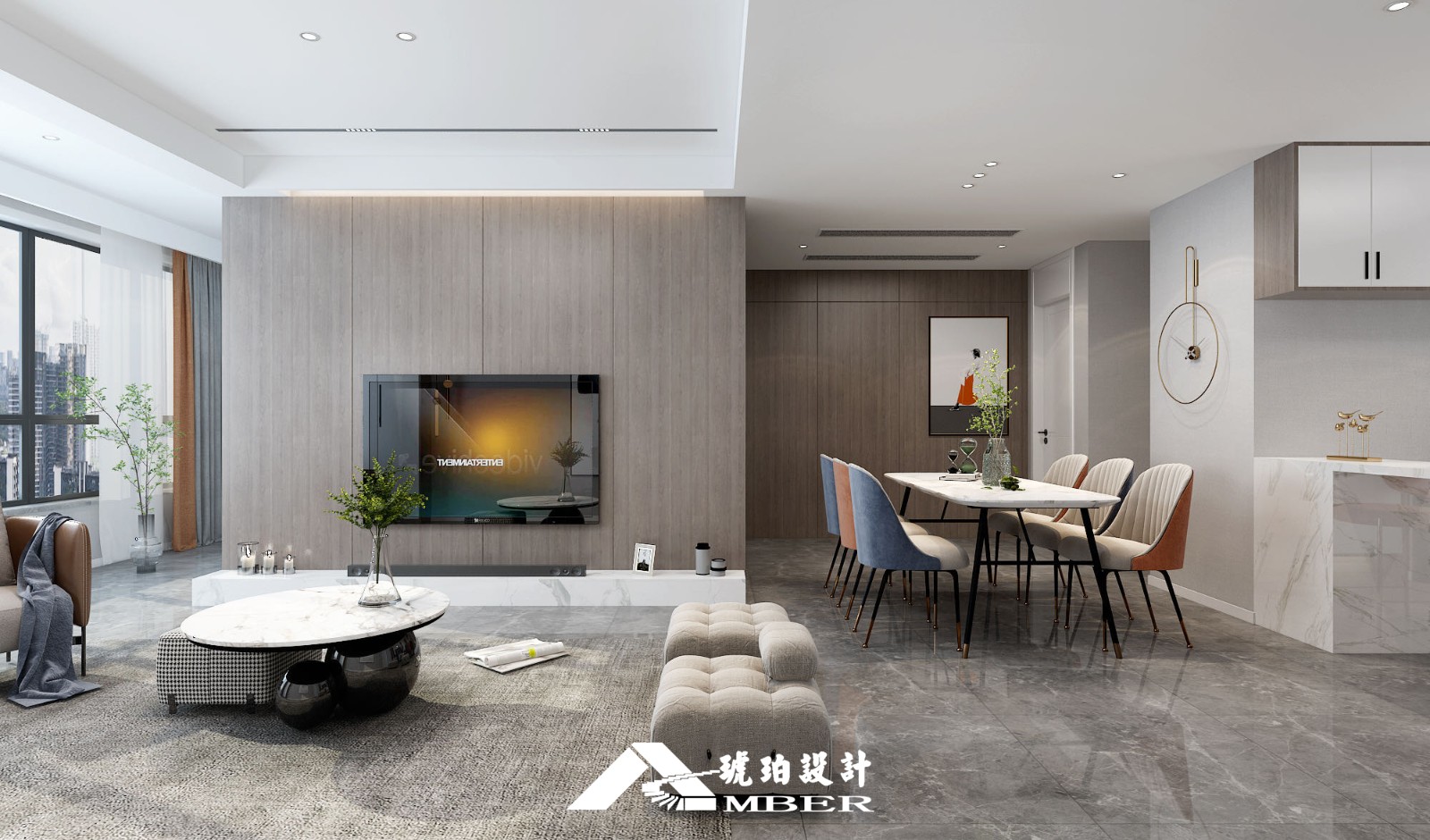 留缝的木饰面背景更像是场景中的音符,在地毯、家具、吊灯间起伏跳跃,将空间凝结成一首光与影的协奏曲,熠熠生辉、灵动悠长。