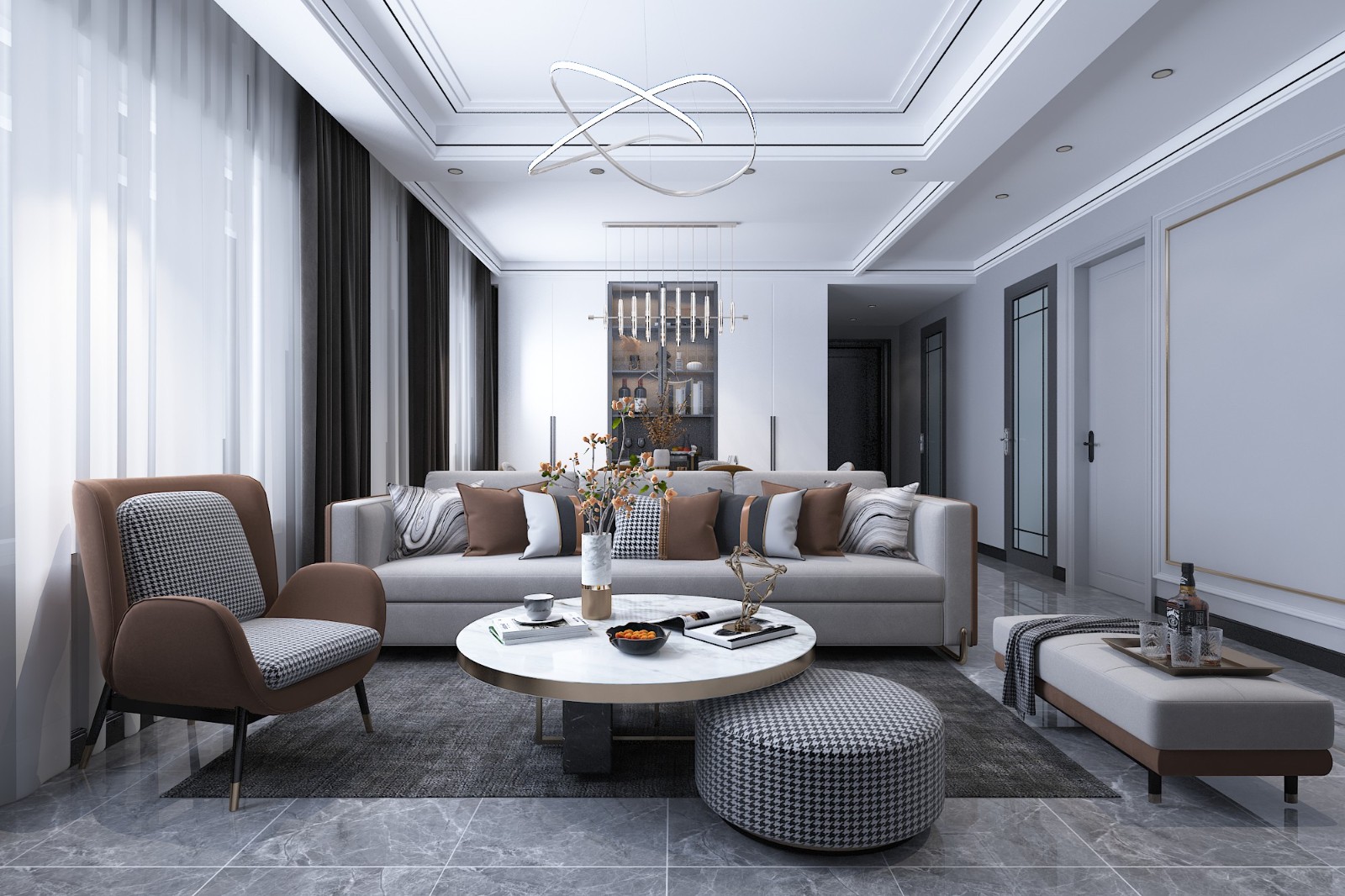 大理石台面的茶几,皮质与布艺搭配的沙发,细腻温和,高端且柔软。