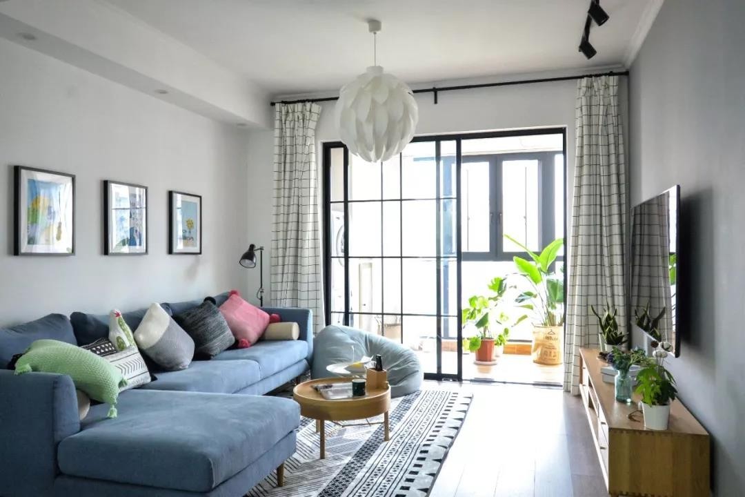 客厅设计以慵懒舒适为主,蓝色的布艺大沙发搭配原木小茶几,预留大面积的空间供小孩撒欢,原木地板的铺设,就算是光着脚丫在地板上跑也不怕。
