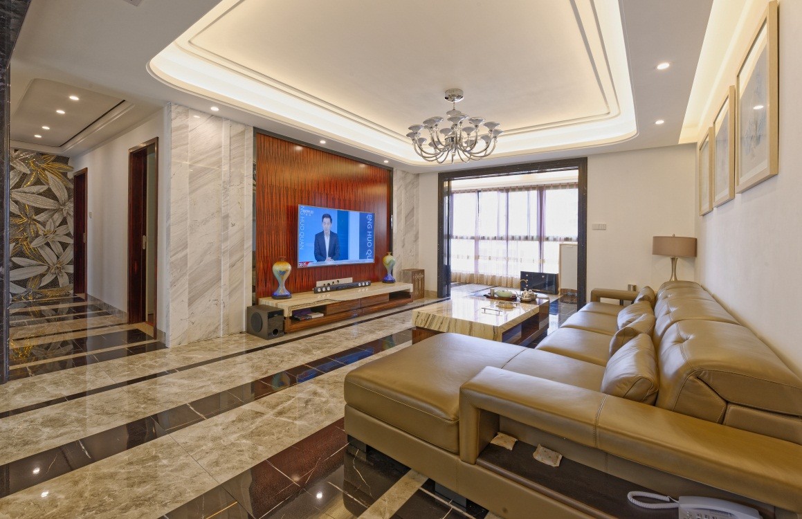 本案大量采用当代简约元素,精致的沙发、皮革、马赛克、玻璃、进口板材、水晶灯、每个空间不复杂,现代元素。
