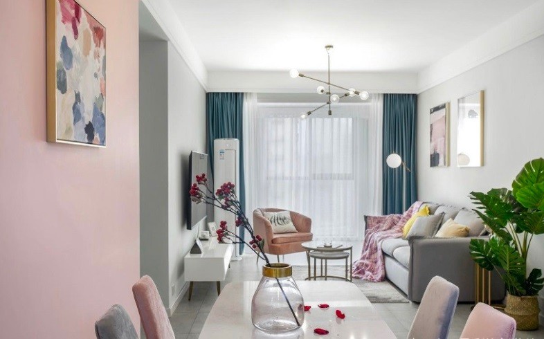 客厅采用丁香灰作为背景色,而家居的配色选用的是低饱和度的色彩,比如暗粉色以及海蓝色,舒适的感官会增加空间的完整性和亲切感
