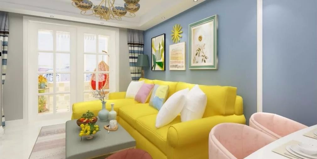 客厅以黄色沙发和蓝色背景墙形成鲜明对比色,再搭配上浅粉色的餐椅,使得北欧简约风不仅仅以传统的黑白灰米色系列等呈现在大众眼前,打破传统规矩,显得尤为清新时尚。