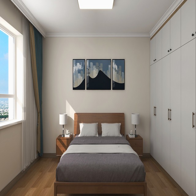 卧室做暖色调墙面,业主用原有的家具做配套,用米黄色的软装窗帘做搭配
