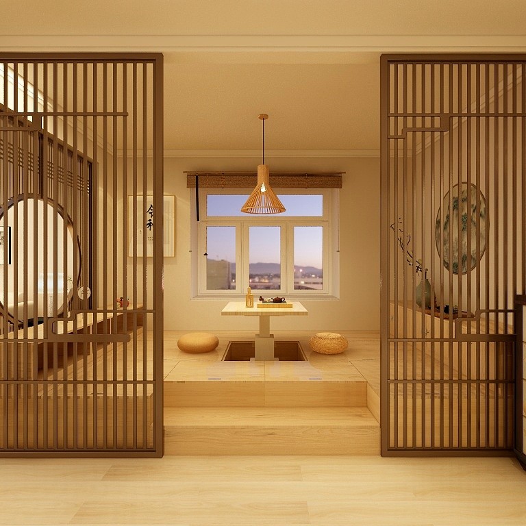 中厅处的榻榻米 与原木格栅使空间增添了神秘感