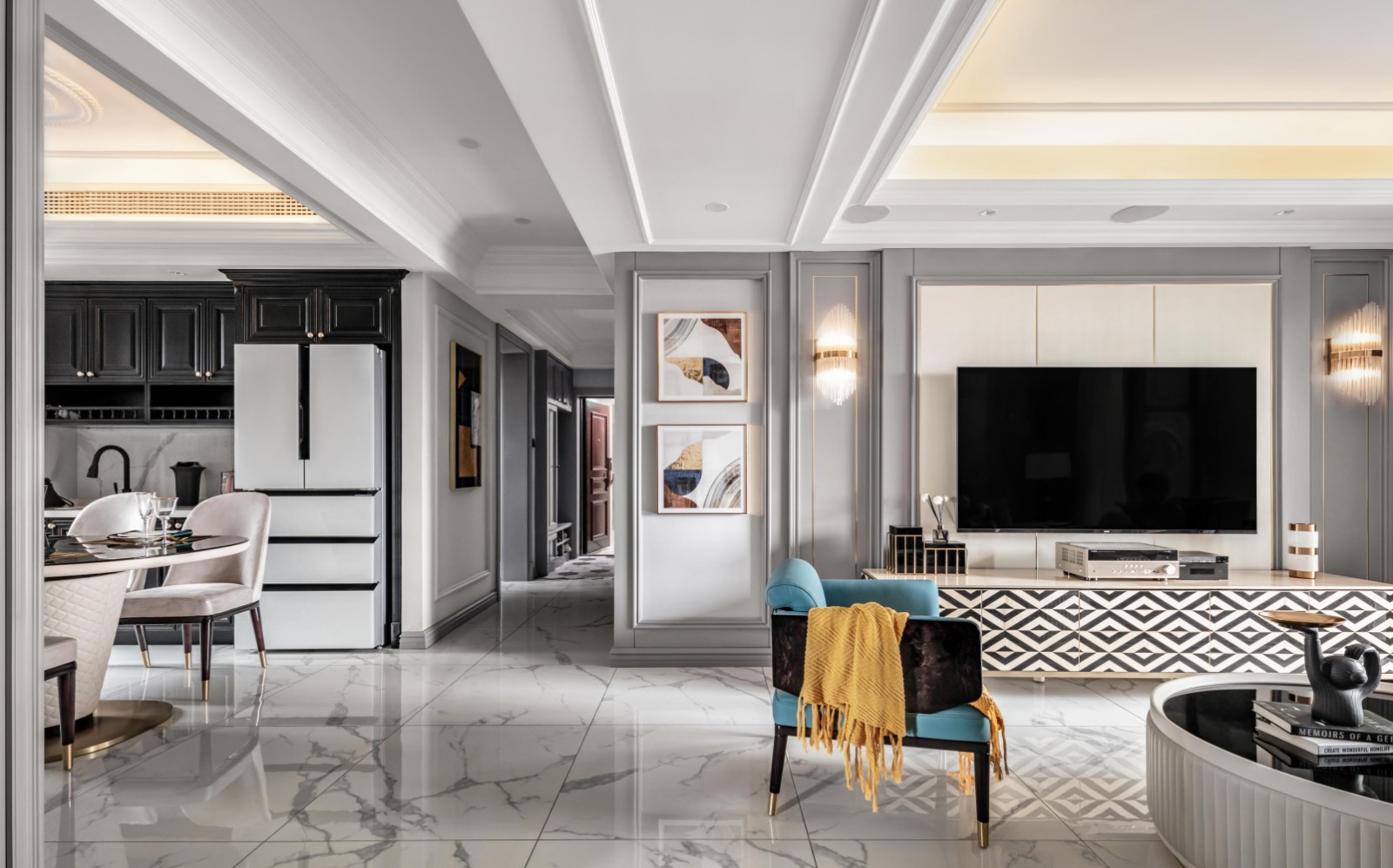 客厅整体以灰白两色为主,局部吊顶沿外围走边一圈,内嵌灯带设计精致大气,搭配轻奢主灯,空间气质大方优雅。