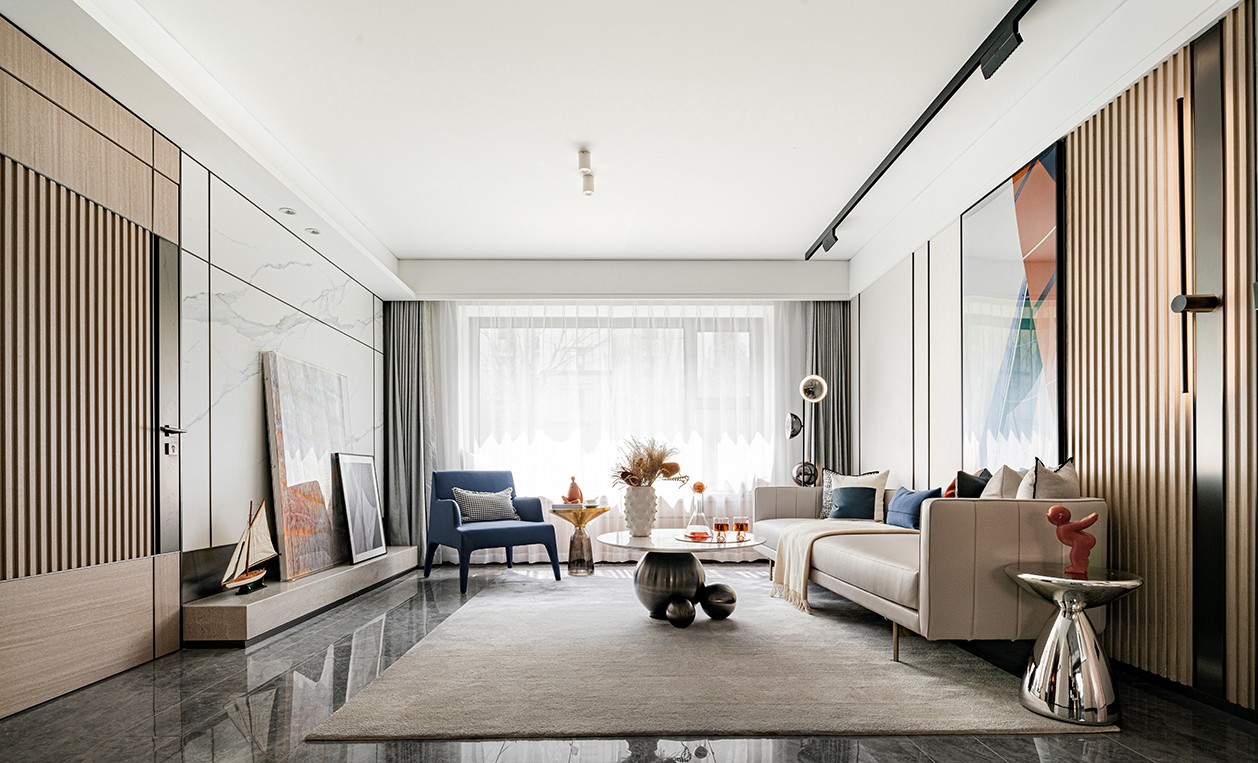 以主人爱好的帆船为主题陈设,个性定制的摆件和品质化的细节,赋予空间活力和美好的寓意。客厅简洁的一字型皮质沙发,搭配选型略带酷动感的沙发,整体时尚有型,且有呼应空间色调。墙面装置取自帆船扬帆的形态,凸显出主人爱好和空间主题。电视柜上,精致的亚克力装裱的挂画,再现波光粼粼的海上余晖。独特的茶几选型为空间增加一丝设计趣味性。