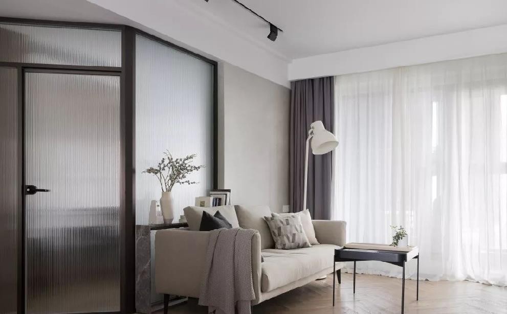 沙发背后的玻璃隔断, 以及处理成斜面的房门, 从这个角度就可以一目了然。 半透的长虹玻璃,既隐私又透光, 也保证了客厅和玄关***的采光度。