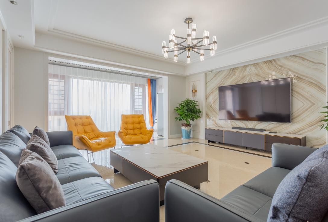客厅的沙发背景墙做了硬包处理,搭配灰色的沙发和两个黄色独立沙发,形成颜色的对比,
