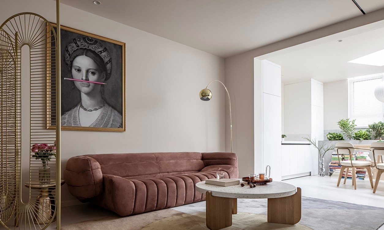 墙顶面使用非常浅的咖色包裹,使用同色系棕色沙发压住画面,地面采用同色系哑光地砖铺设,搭配黄铜屏风与金色落地灯,空间使用复古元素连续穿插,整体使用大地色系制造温柔
