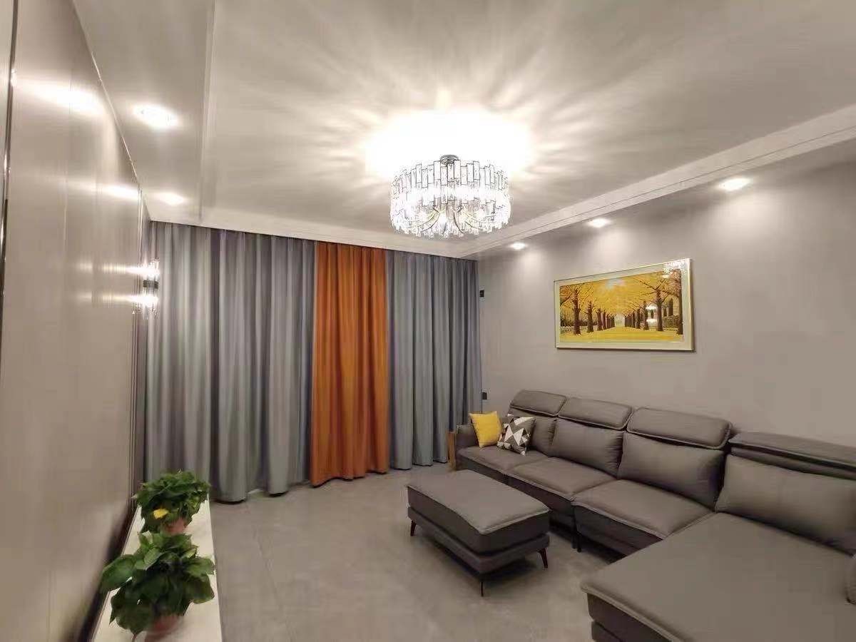 客厅主色调为月光灰色,稳重求重,窗帘选择上加了当下流行的爱马仕橙,空间有了颜色,瞬间点亮。