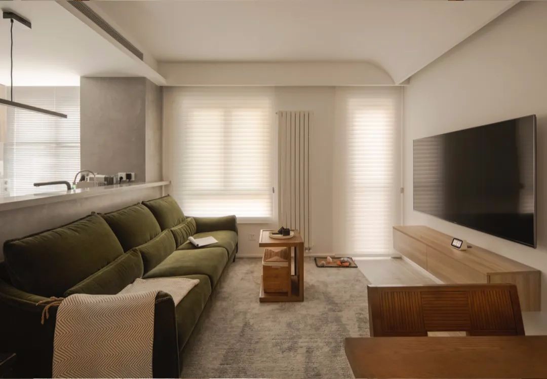 客餐厅部分的软装处理,保留旧有物品,选择l绿色布艺沙发点亮客厅的色彩,采用极简铜灯,保留空间的干净