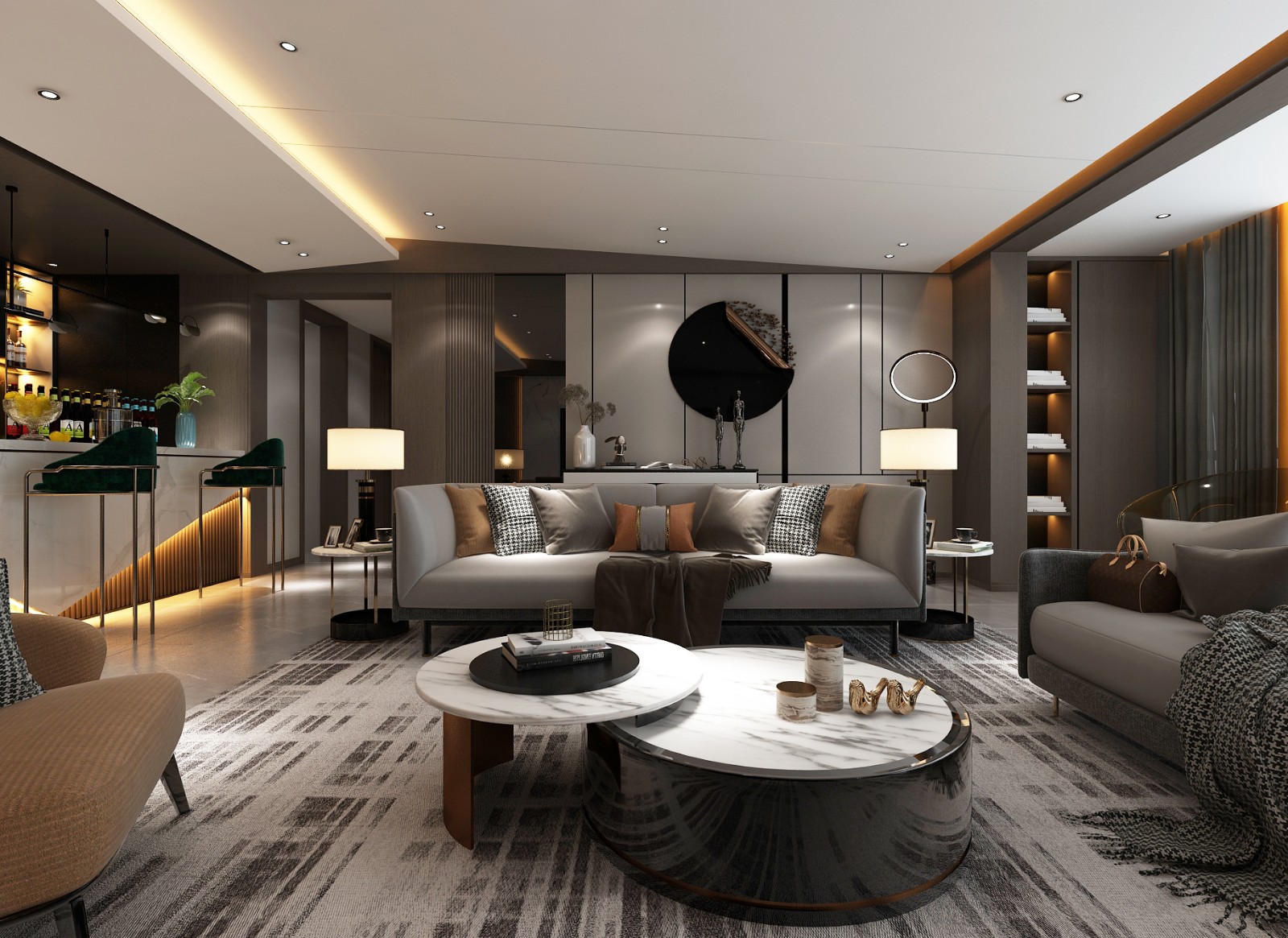 设计风格上利用黑白灰+棕色调,黑人给人以神秘,白色给人以优雅,而棕色作为中性色以及本案设计格调,在家具、装饰材料上打造自己的风格和地位,从而完美地体现现代风格的时尚潮流。