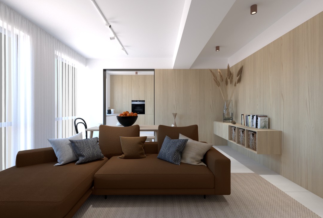 L 形的棕色沙发划分出了客厅的区域