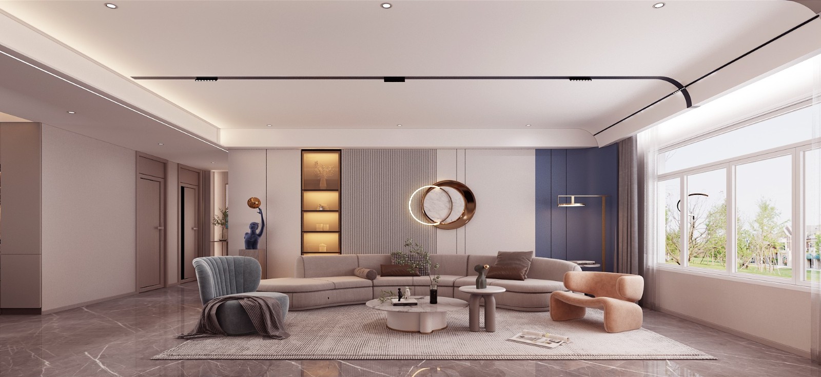 客厅优雅舒适,无主灯设计拉高了视觉上的纵深感,让空间多了一些干净和利落。