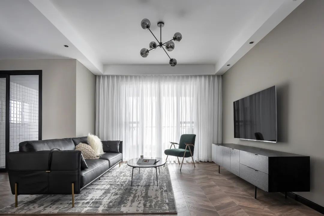 打通入户连接到客厅空间,一旁多功能房安装的玻璃门,都使得客变得敞亮不少。
