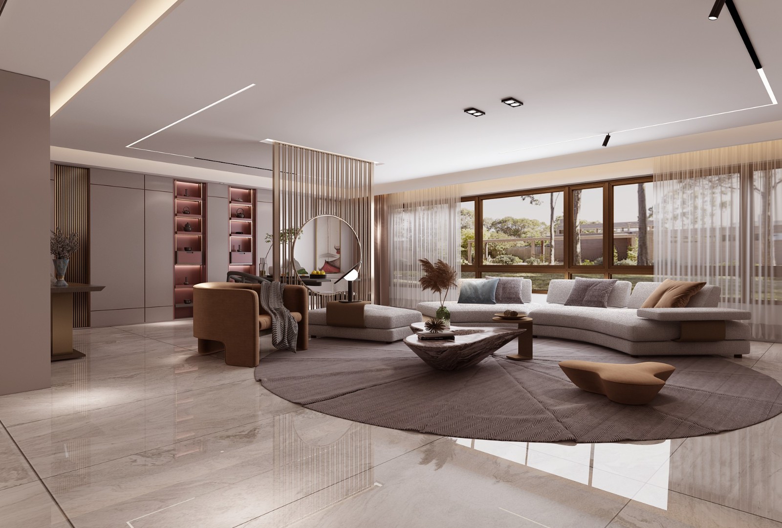 客厅温婉舒适,无主灯设计拉伸视觉感衬托落地窗明亮大气。金色隔断在背景墙和沙发之间隔出了茶室,背景墙设计了粉色的储物格,摆放茶具。