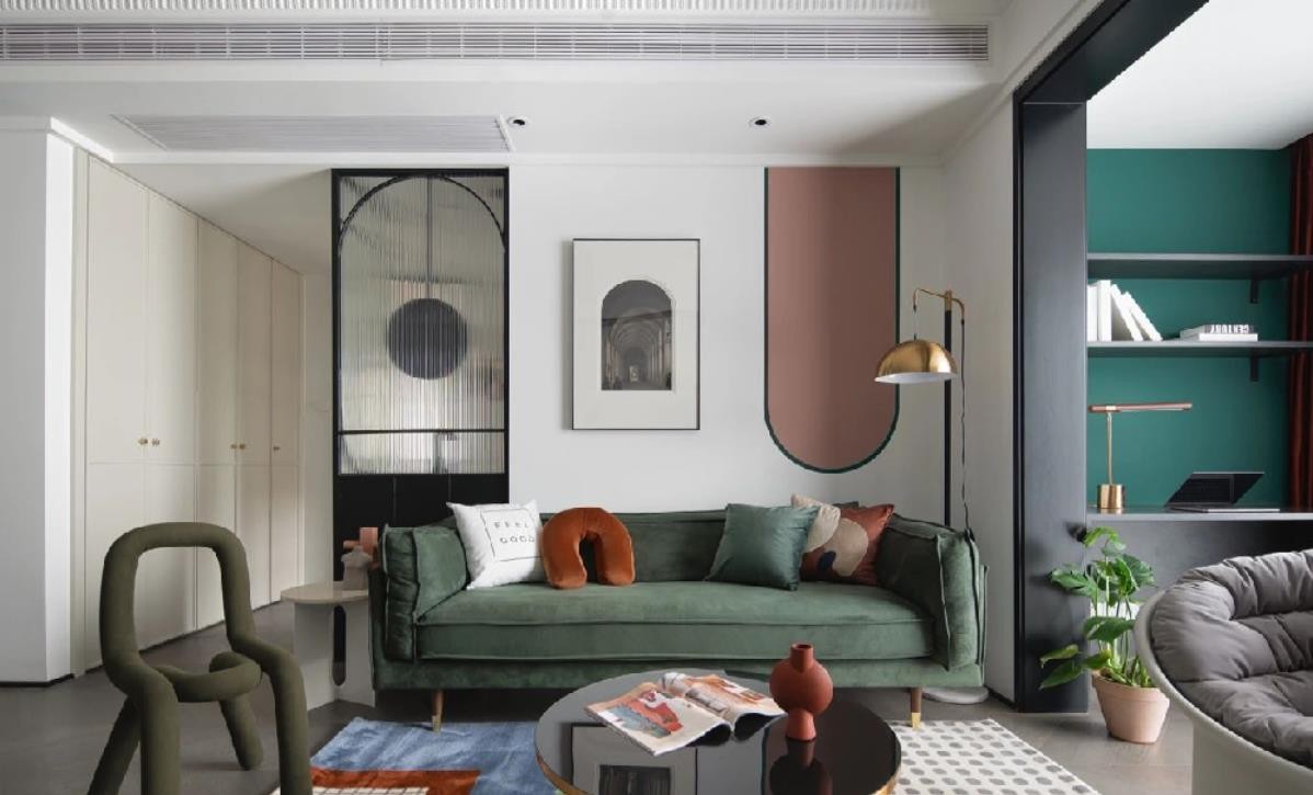 客厅空间以白色为主色调,融入墨绿、酒红、脏粉等低饱和度彩色,为空间增添了缤纷、动感的视觉效果。