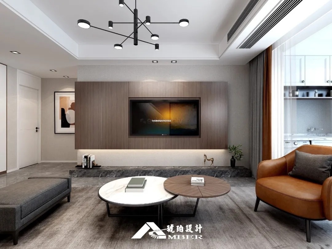 电视背景采用木饰面和墙布的碰撞,硬朗的木饰面质感柔和、与细腻的墙布形成材质本身的反差,增加墙面的立体感,木饰面向过道的延伸,电视柜的设计采用了简单的大理石地台,做到了简洁、大气、整体。