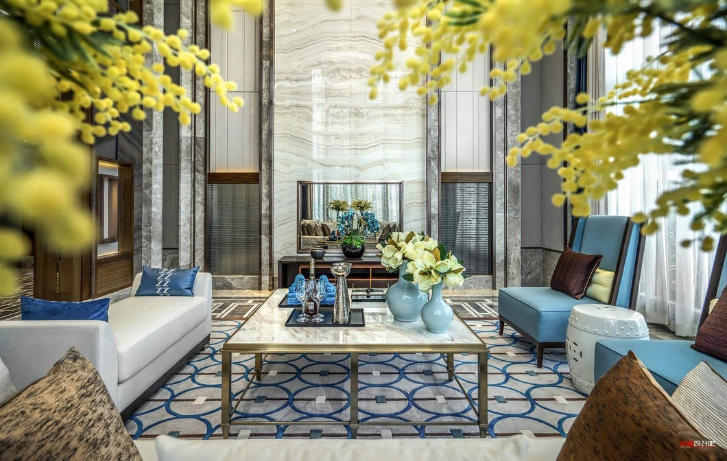 米、蓝色的简约沙发、精致的茶几摆件,与棕蓝相间的地毯相呼应。沙发后面用黄色鲜花加以点缀,使整个客厅温馨感十足。