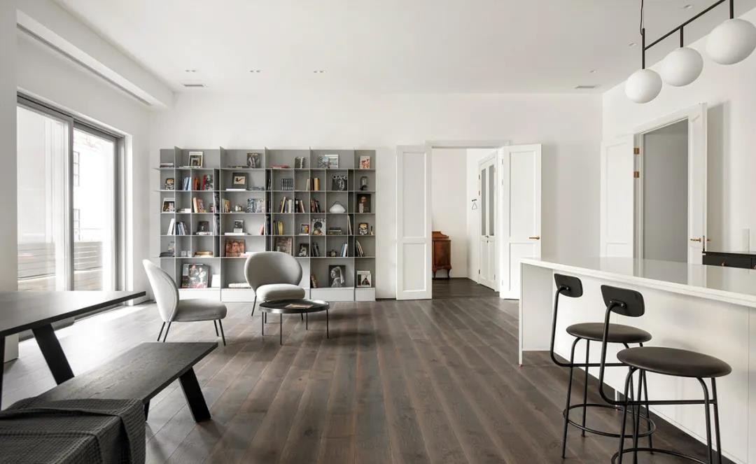 业主希望自己的话可以保留老建筑的典雅也可以拥有现代风的极简利落,所以设计师在改造时,保留了大气的双开门和深色的地板,整体效果非常的抢眼