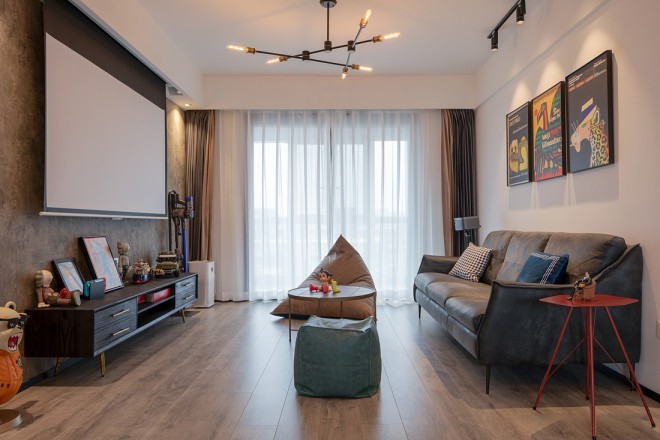 沙发和电视背景墙保持了一致的风格,选用了灰色做旧的材质,配上蓝色坐墩和松软的懒人沙发,中间放上一个小巧轻便的茶几,一家人以姿势坐在沙发上,吃着小零食,追着喜爱的电视剧,欢笑不断,所有的疲惫都在此刻烟消云散~
